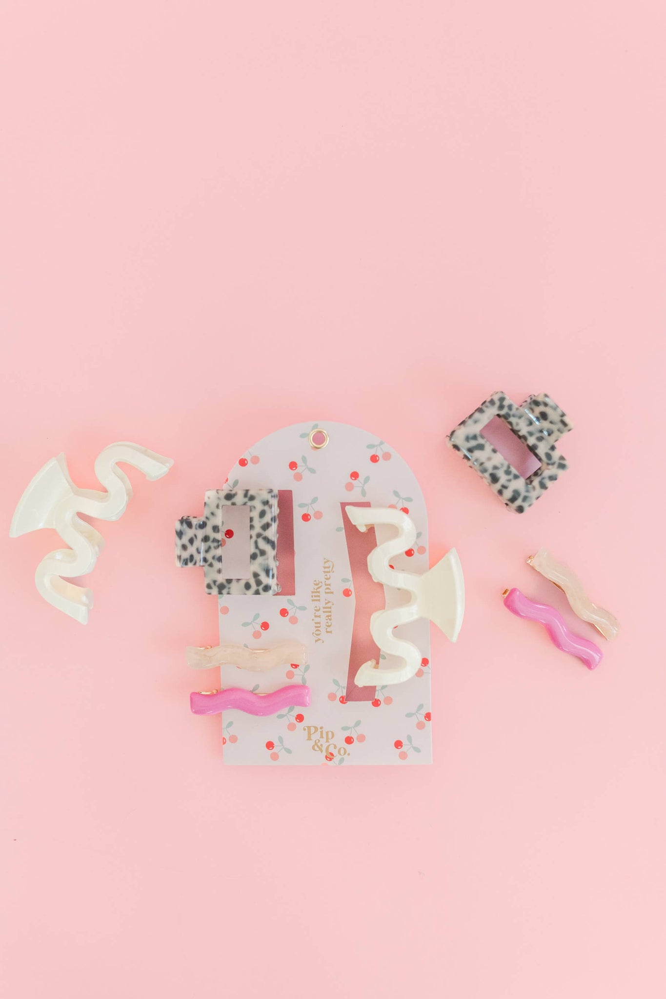 Set, Gift set, wavy, leopard, wave, cherry, hair accessories, hair clip, claw clip, pastel hair clips, trendy, animal print, colorful, cute hair accessories,