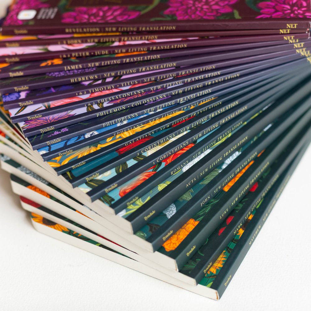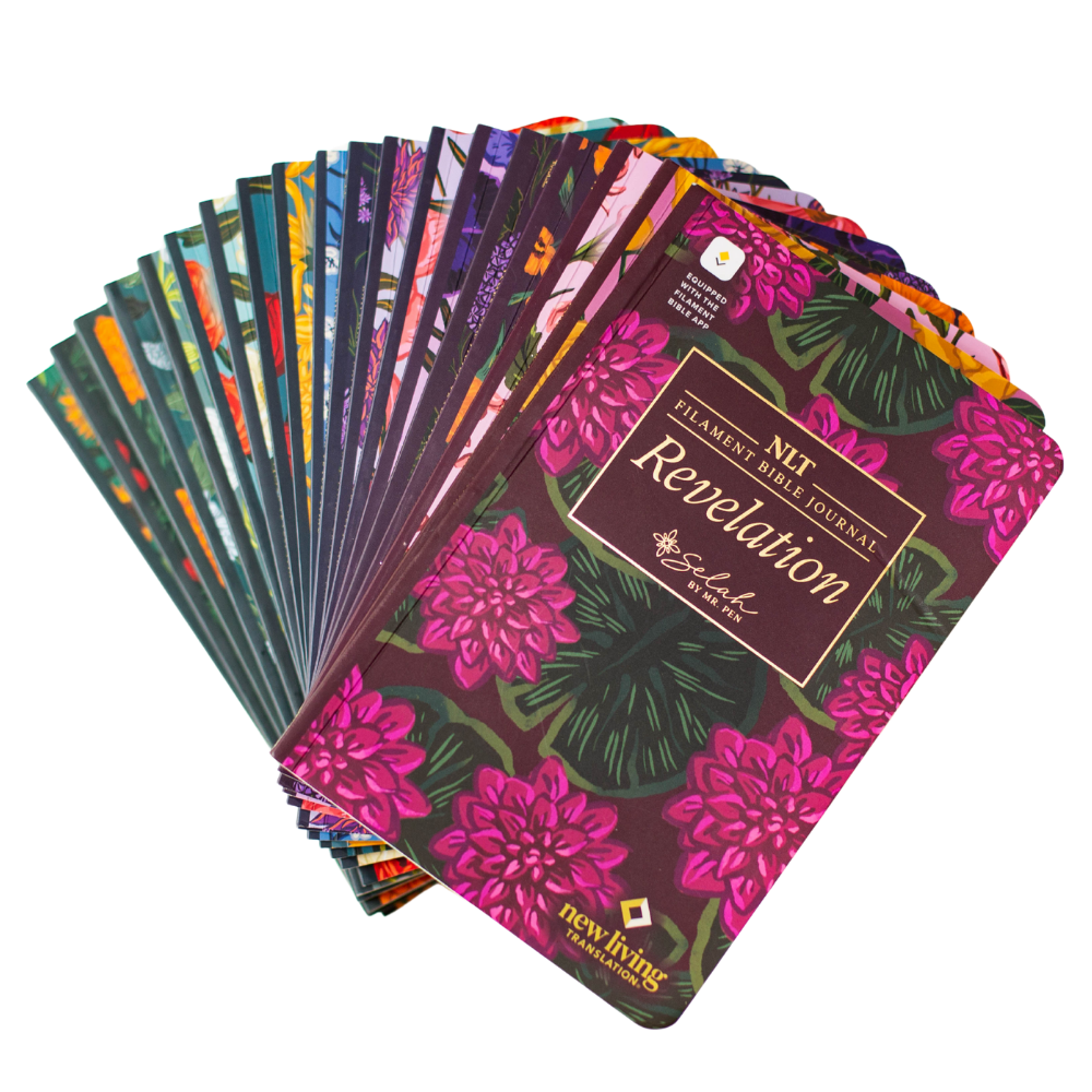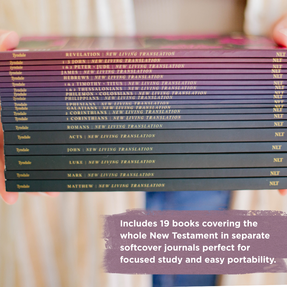 * This journal set includes 19 beautifully floral designed softcover books, each having a different book or books of the New Testament in the easy to read NLT translation. * Crafted with thick, cream-colored journaling paper, every book features ample space on every other page for prayer notes, reflections, or sermon insights. * Built with Smyth sewn binding, each journal lays completely flat perfect for writing without hassle whether at home, church, or Bible study. * Easily connect with the Filament Bible app to access rich study tools, devotionals, maps, and more. Turning every page into a deeper learning experience. * Lightweight and portable, this collection is ideal for on the go study, personal devotionals, or small group engagement and looks stunning on any shelf.
