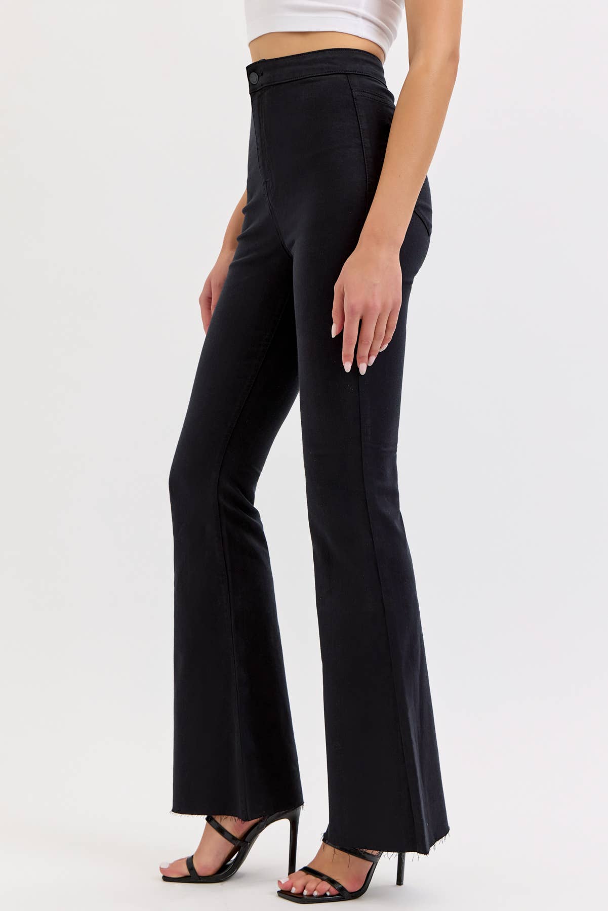 High-Rise Super Flare with raw Hem Black Denim Import Inseam: 33” Rise: 11 1/2” Fabric Content:54%Lyocell,33%Cotton,11%Elasterell-P,2%SP