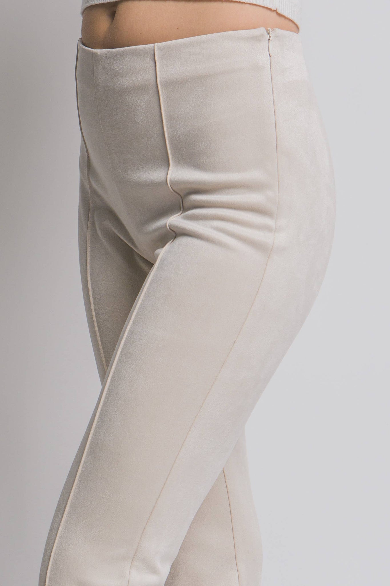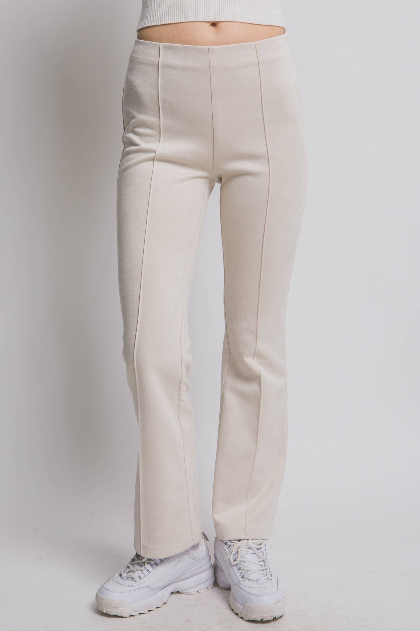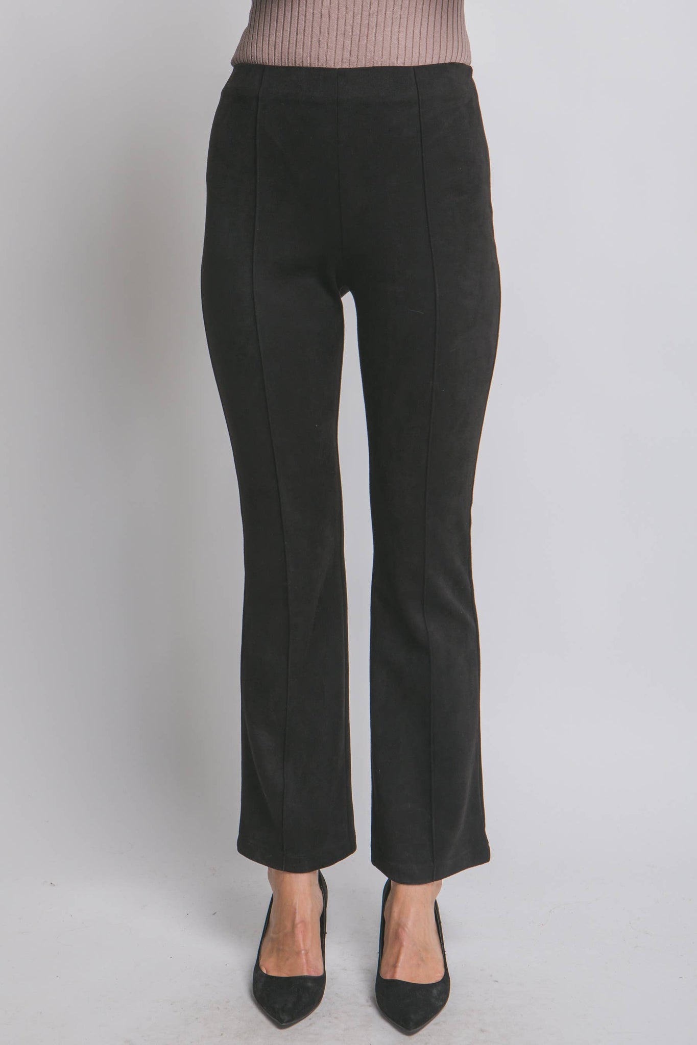 FAUX SUEDE FLARE PANTS FT HIGH WAIST, SIDE ZIP CLOSURE AND PIPING DETAIL DOWN THE FRONT 95%POLYESTER 5%SPANDEX MADE IN VIETNAM PL8735