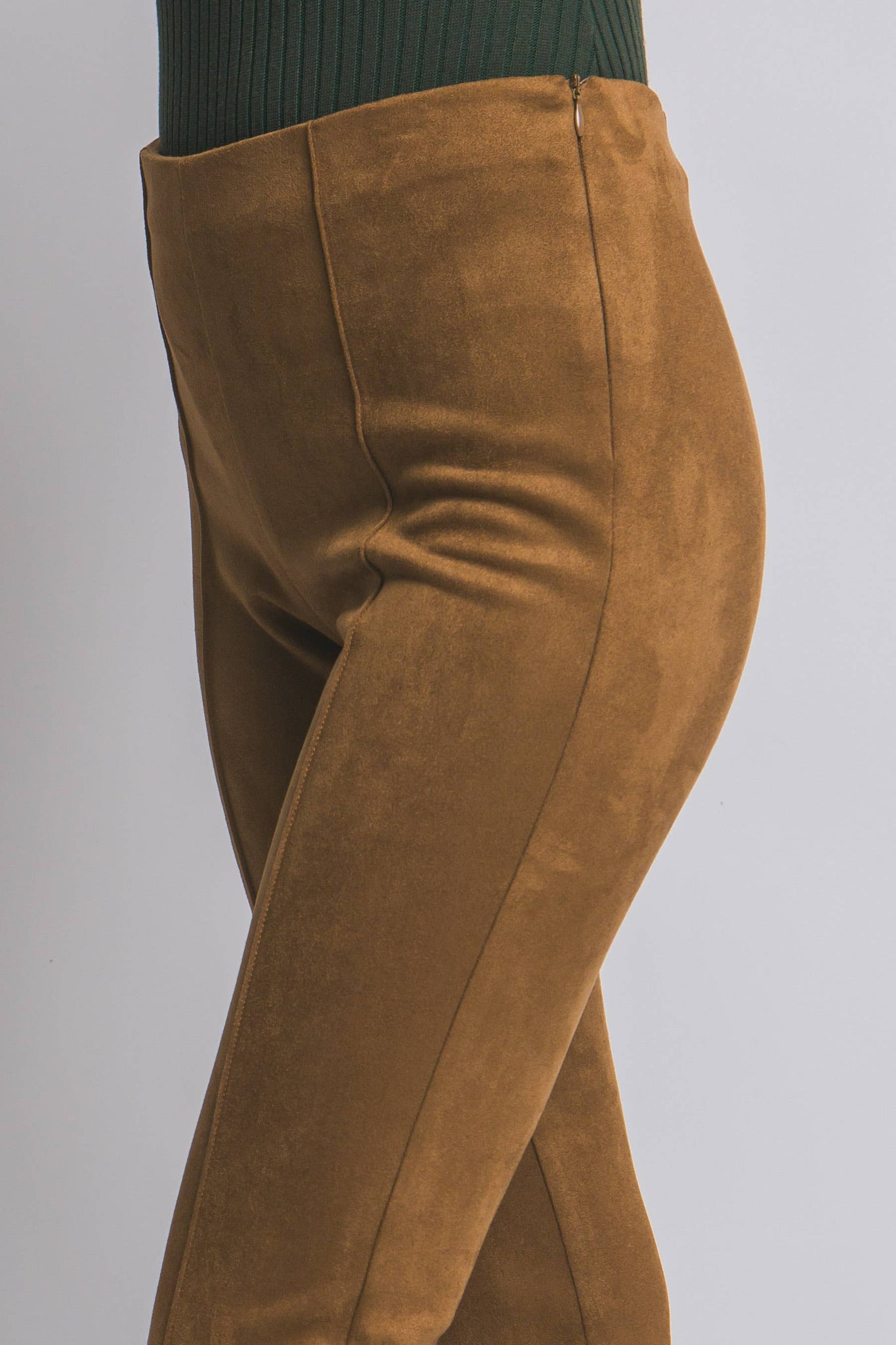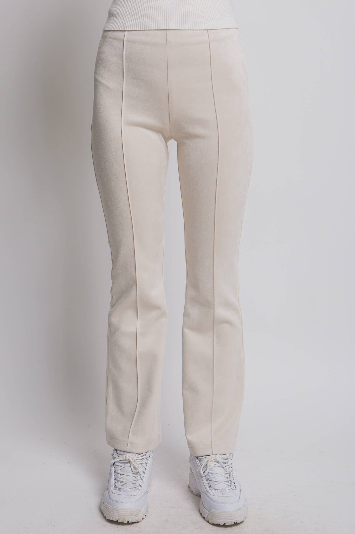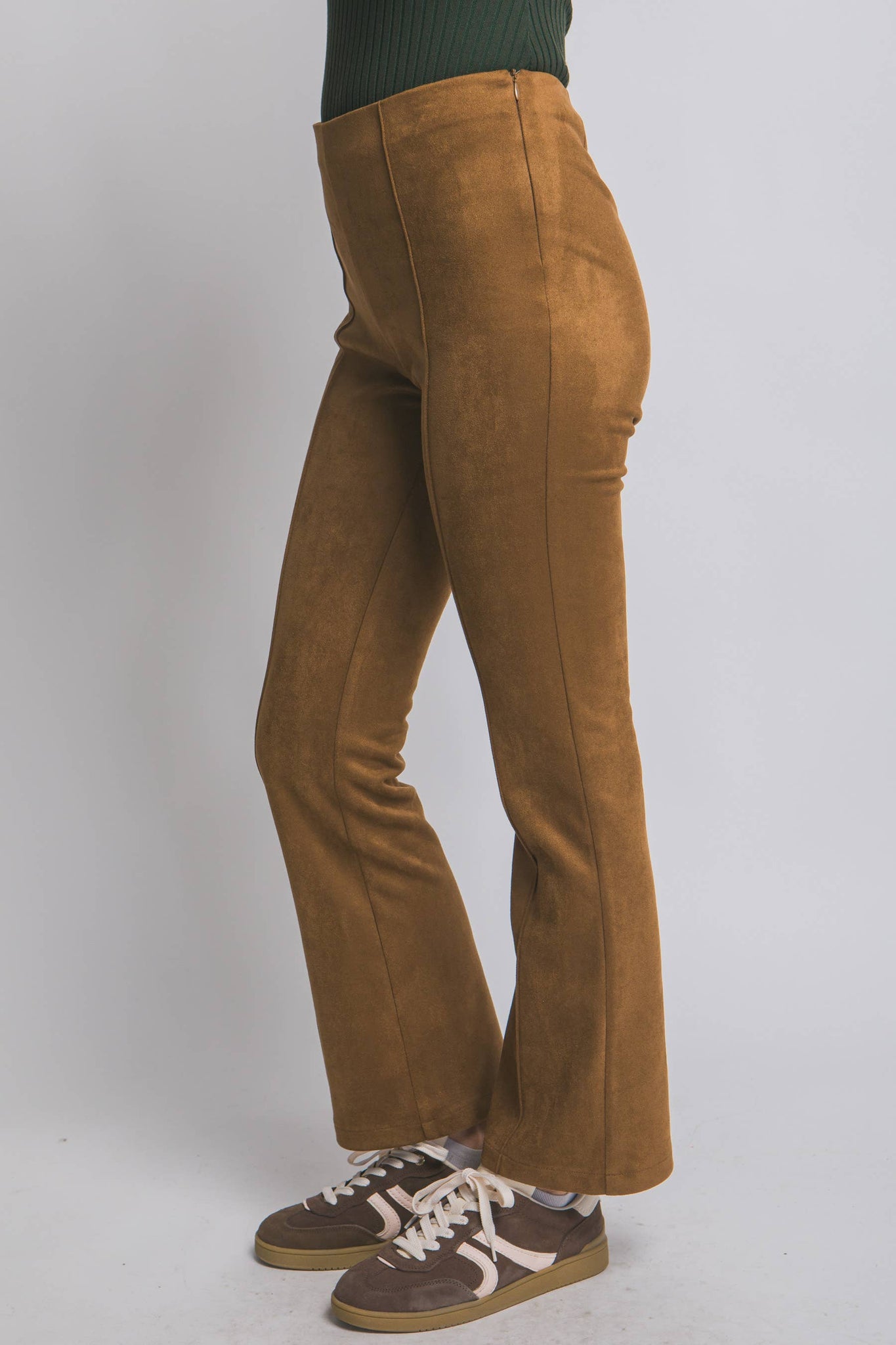 FAUX SUEDE FLARE PANTS FT HIGH WAIST, SIDE ZIP CLOSURE AND PIPING DETAIL DOWN THE FRONT 95%POLYESTER 5%SPANDEX MADE IN VIETNAM PL8735