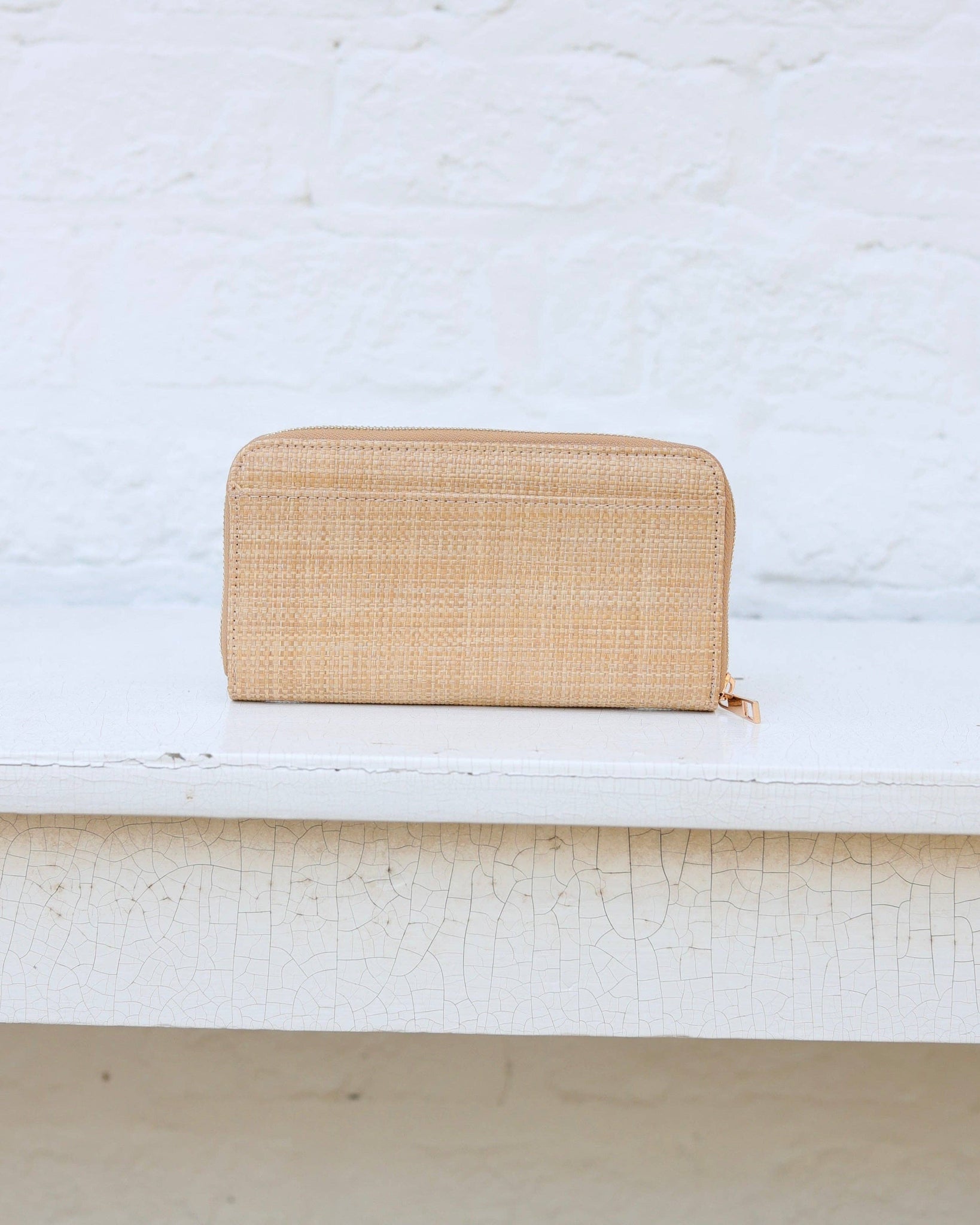 The Penelope Wallet in Natural straw features an elongated zip design with a central zippered coin pouch and two sets of card holders for organized storage. An outside slit pocket offers quick-access space, making it a stylish and practical accessory that holds all your daily essentials effortlessly.