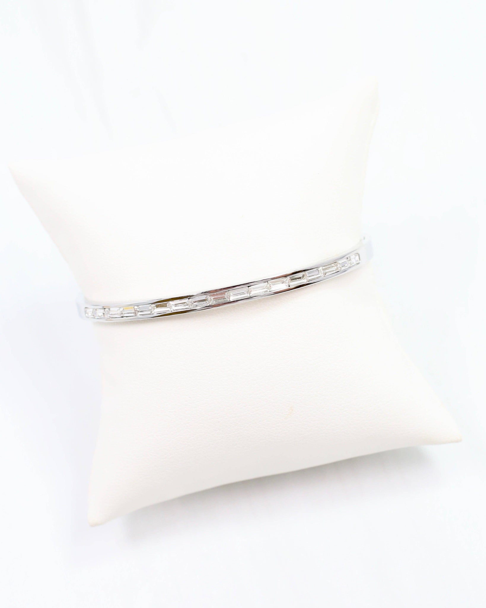 This Nyx Bangle Bracelet in silver features a sleek baguette CZ design and a secure side-hinged tension closure, combining elegance with ease of wear. Its refined style makes it a versatile accessory that complements any outfit while providing a comfortable fit for everyday use.