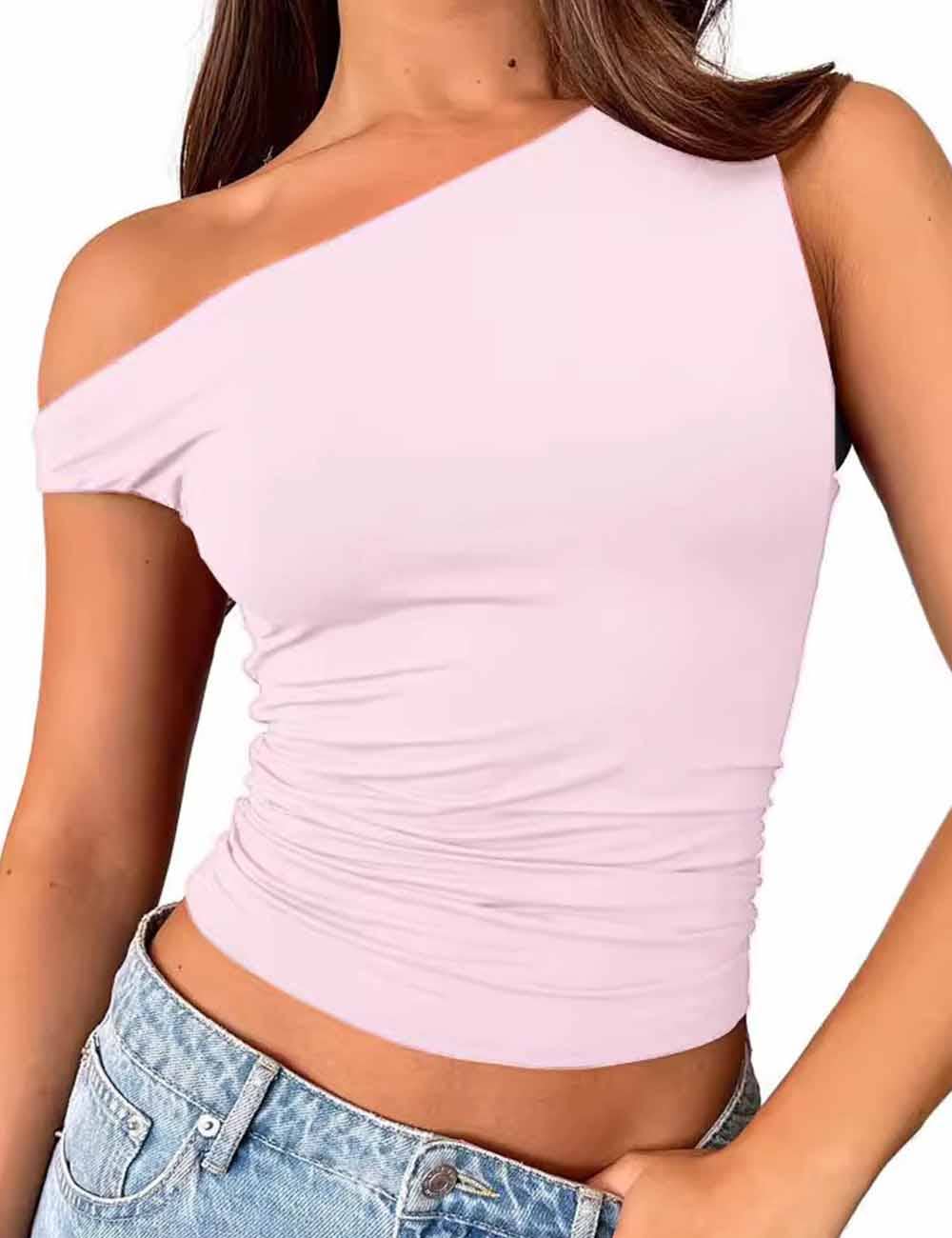 Ladies Solid Color Ruched One Shoulder Short Sleeves Top