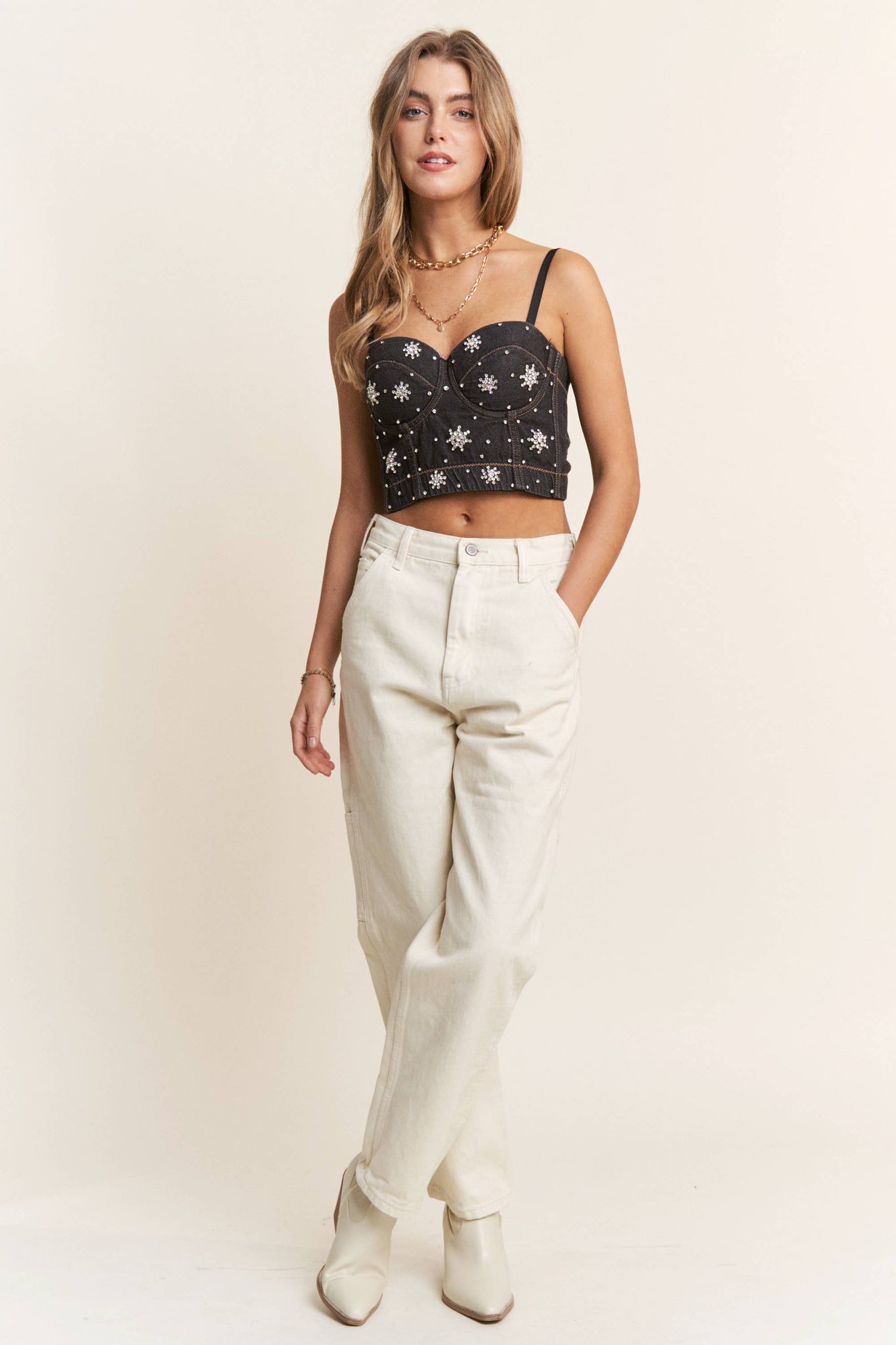 Feel beautiful on your night our wearing our denim rhinestone embellished bustier crop top. The straps are adjustable and it closes at the back with an eye and hook closure. The rhinestone are almost snowflake like making it perfect for a winter outfit. Wear it with a skirt or cute denim jeans with your favorite heels.