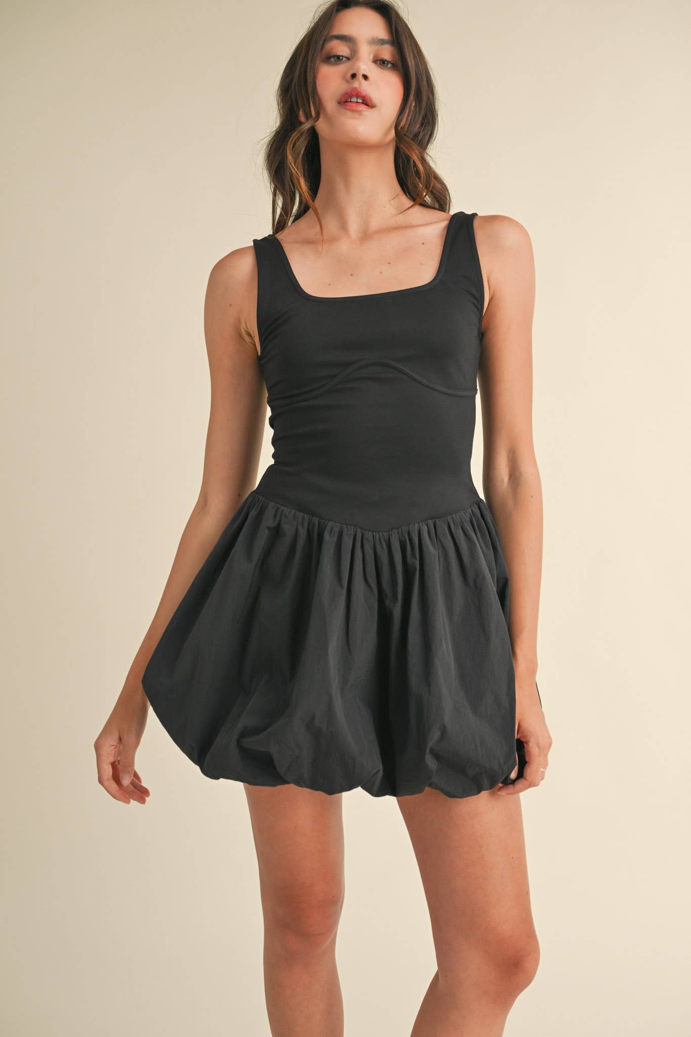 Start the night off just right with a perfect look like this bubble hem mixed media mini dress! Stretchy fabric shapes this stunning bodice that features a scoop neckline and a sleeveless bustier-inspired bodice with bust binding detail. Basque-style waist sits atop a woven mini skirt that finishes at a gorgeous bubble hem.