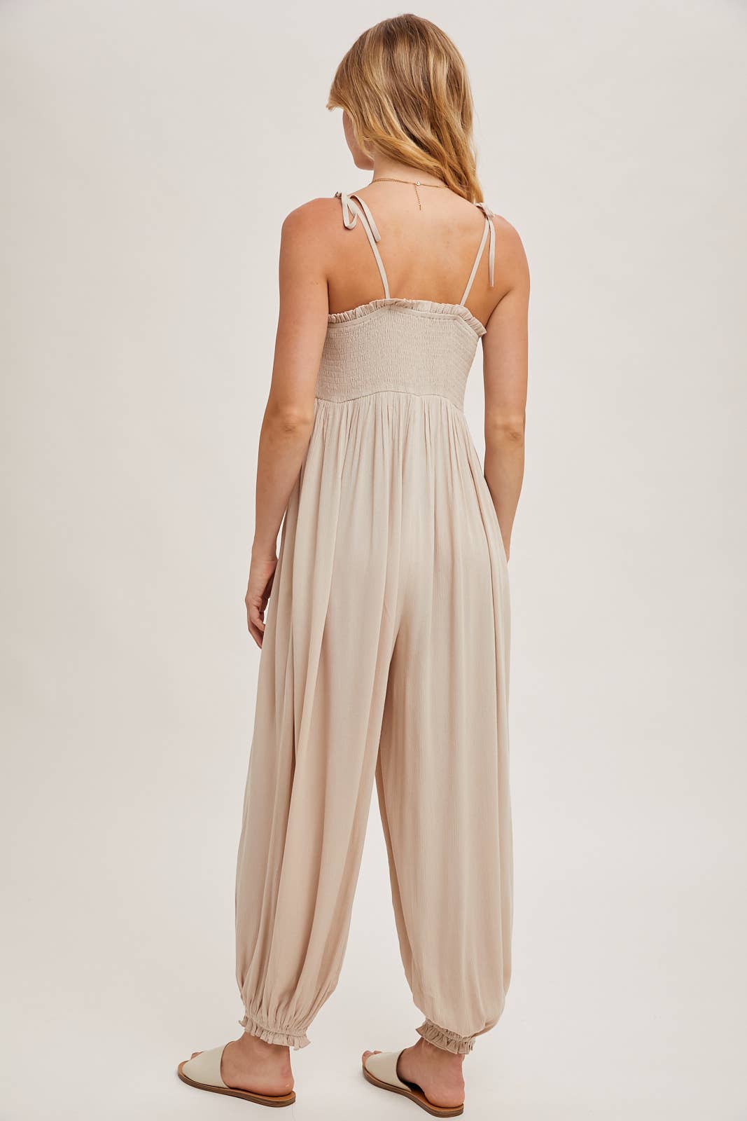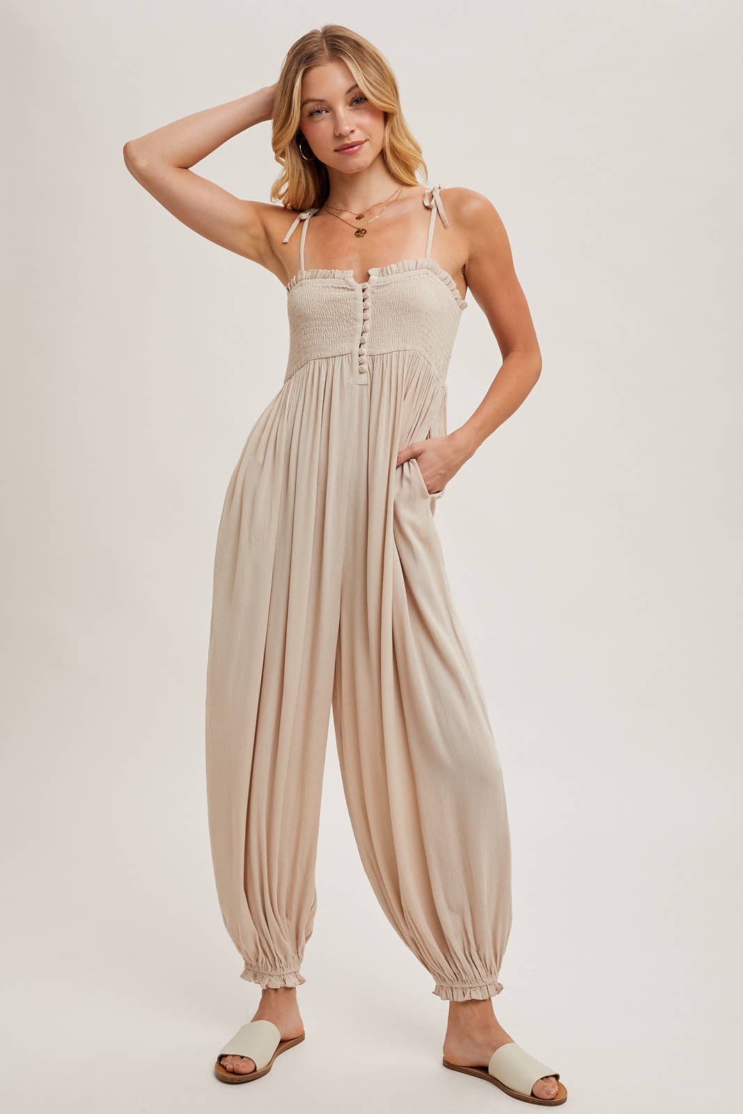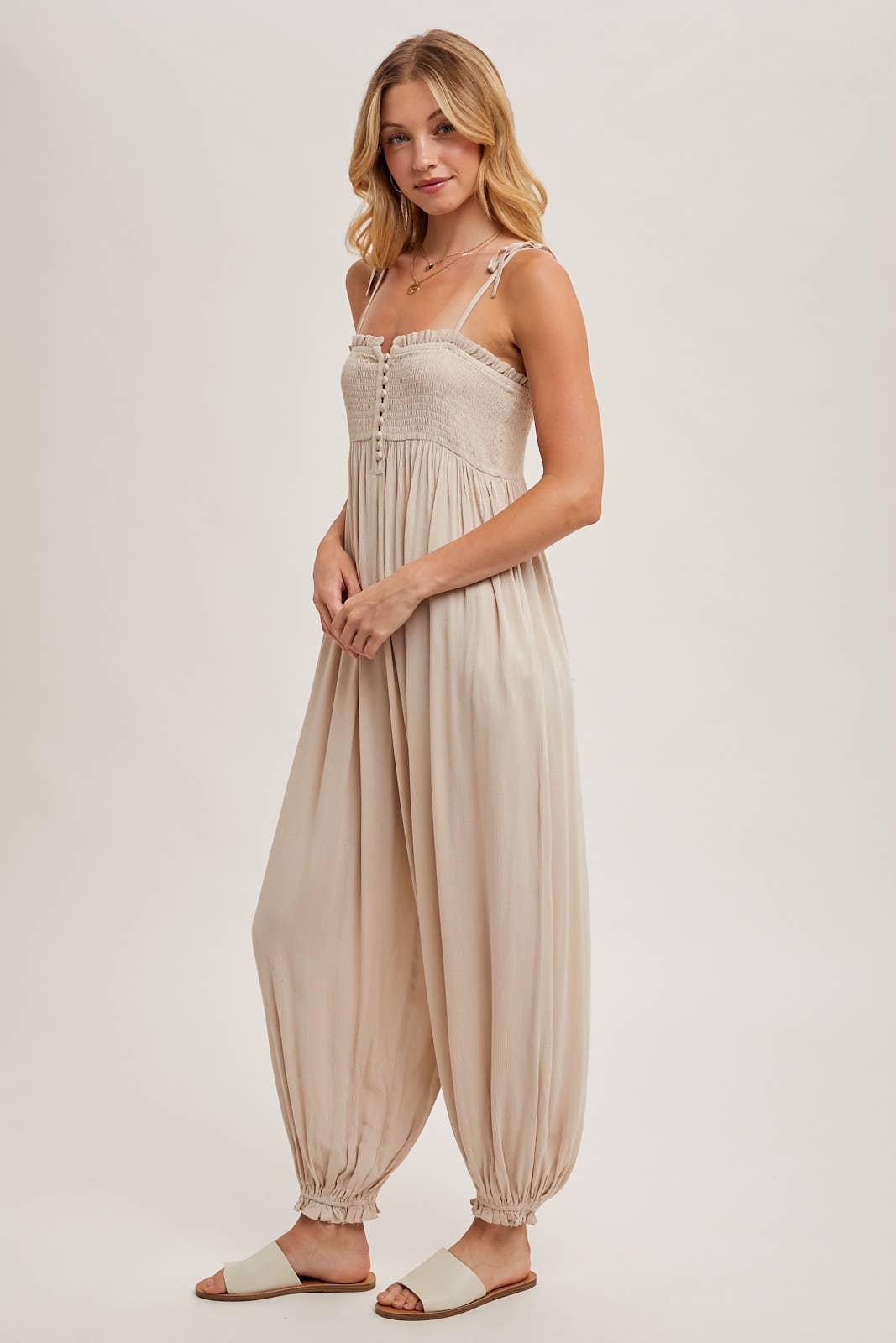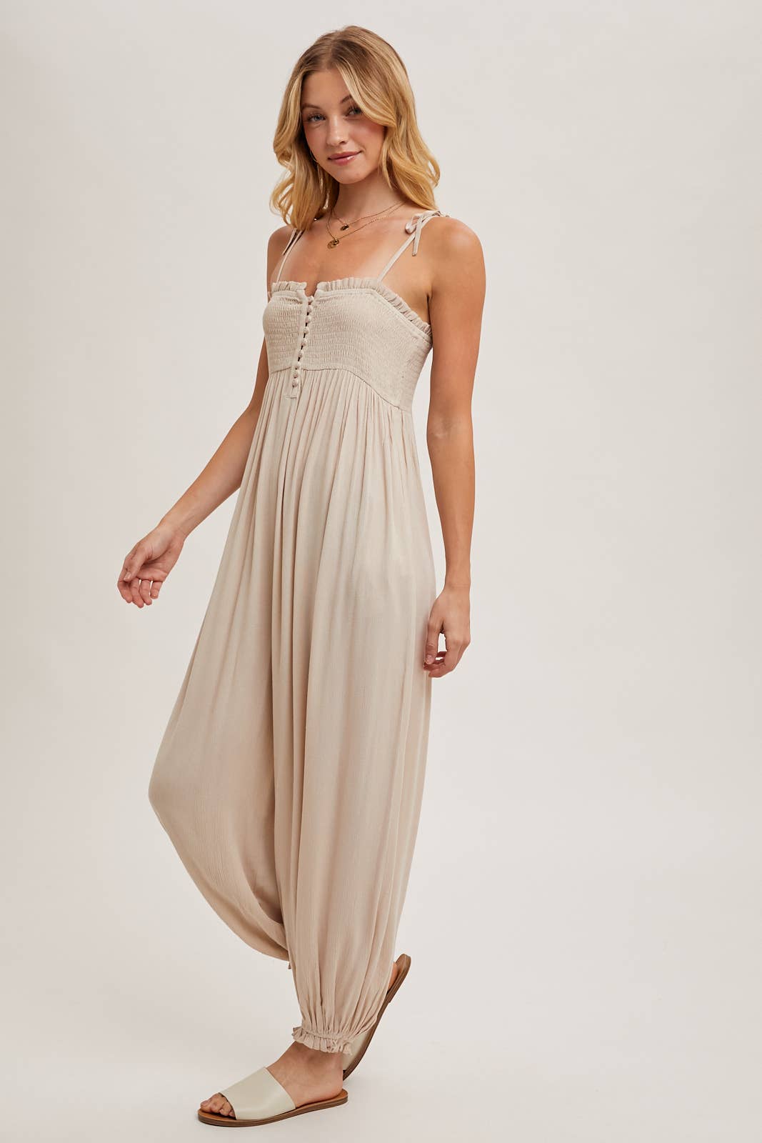 GAUZE SMOCKED BUTTON FRONT SHOULDER TIE JUMPSUIT