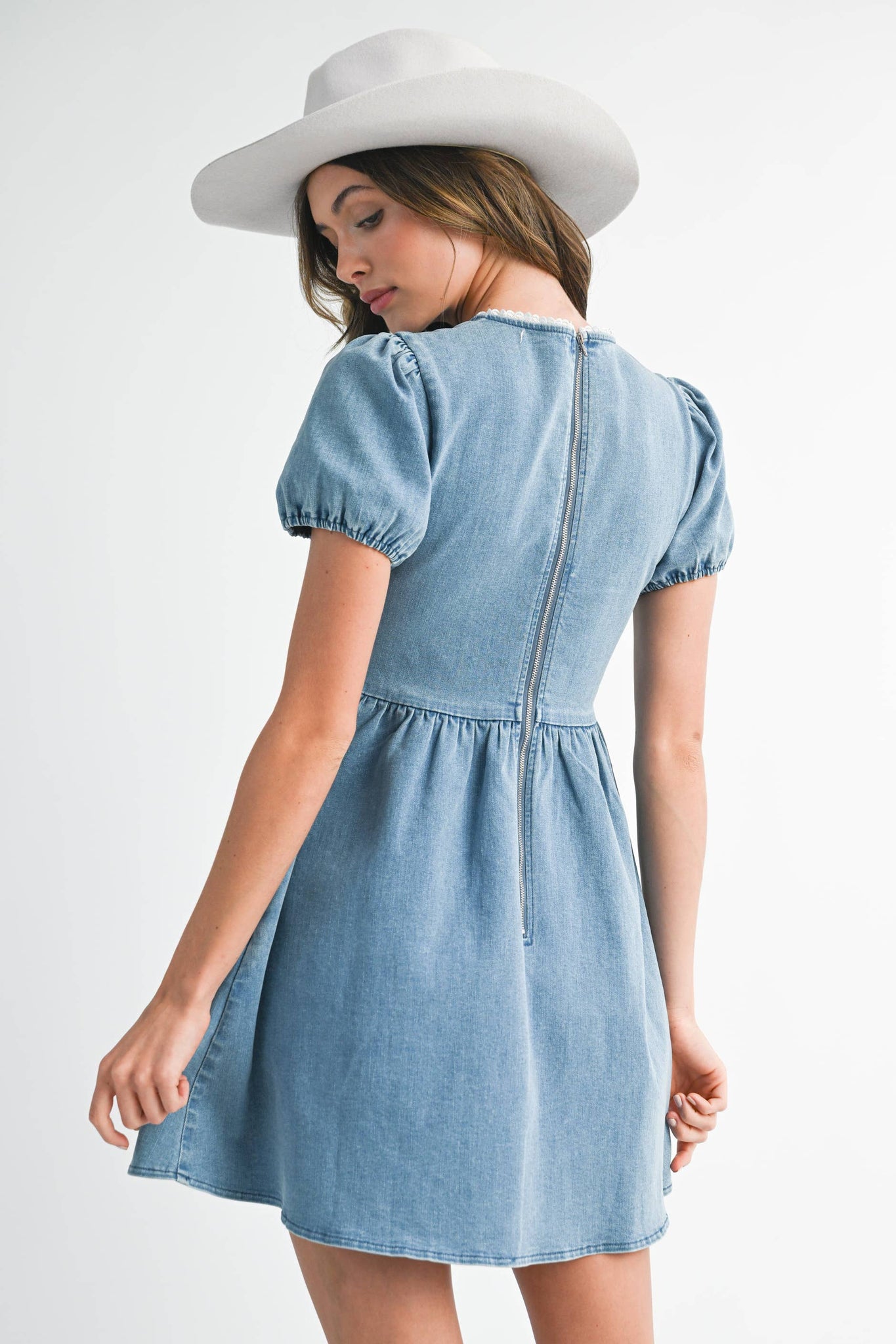 This light blue denim mini dress features puff sleeves and a gathered skirt for a flared silhouette.