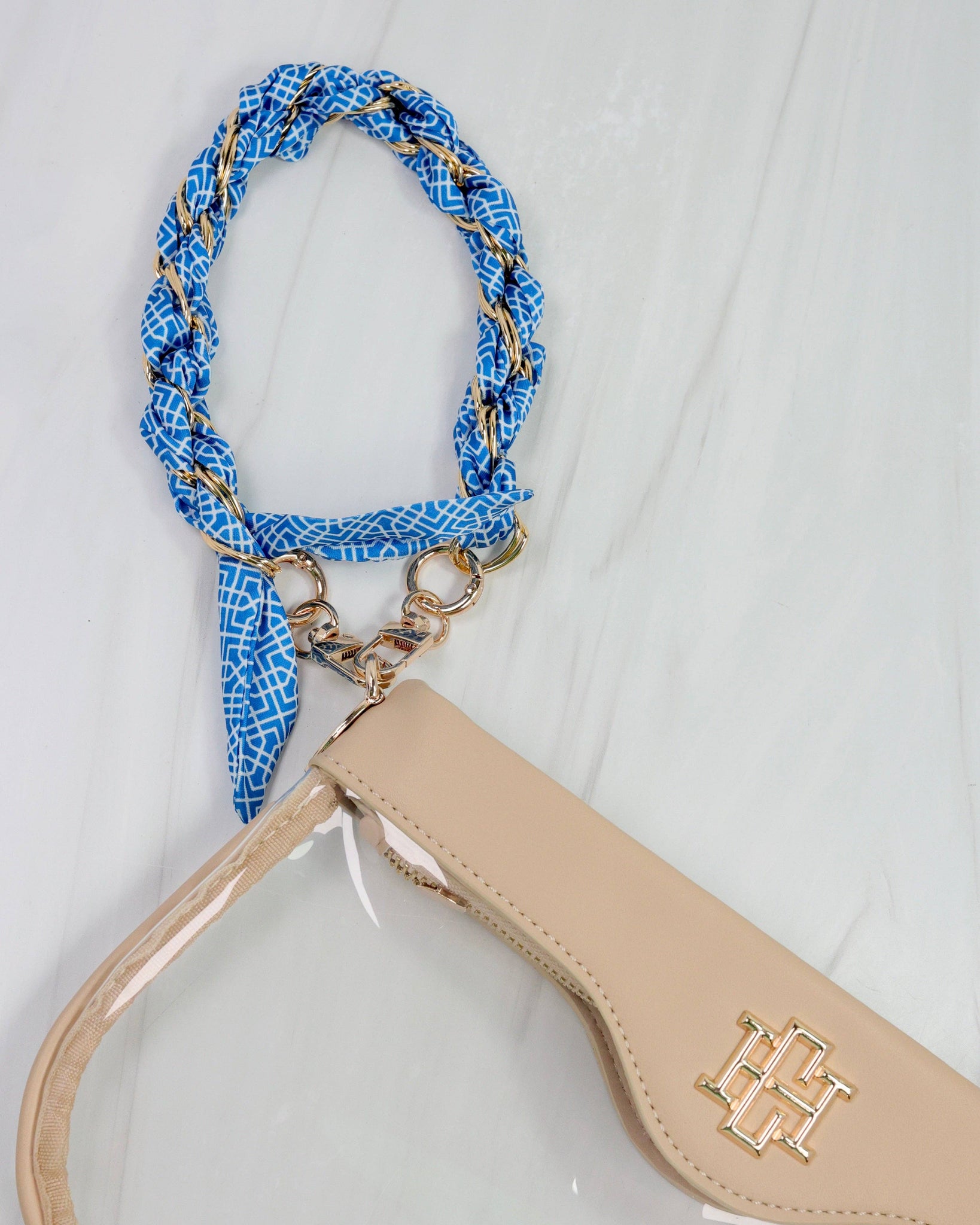 Elevate your accessory game with the Serafina Scarf Purse Chain in a fun Blue and White geometric print. Featuring a chic gold link chain intertwined with a stylish printed scarf, this piece effortlessly combines school spirit with sophisticated fashion. Perfect for adding a refined yet spirited touch to your favorite handbag.