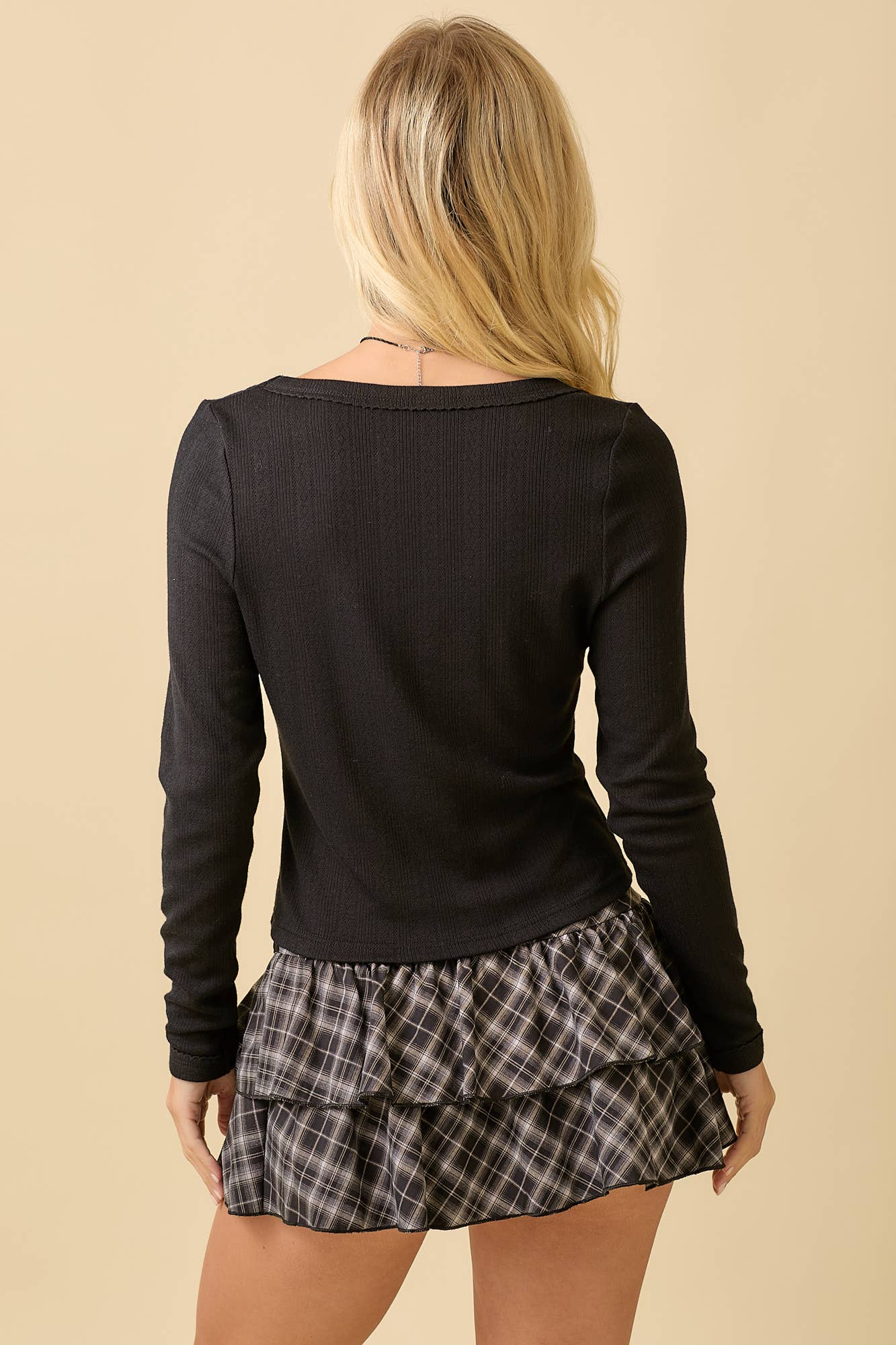 Square Neck Pointell Knit Long Sleeve Top With Ribbon Bow Detail 80%POLYESTER 14%RAYON 6%SPANDEX