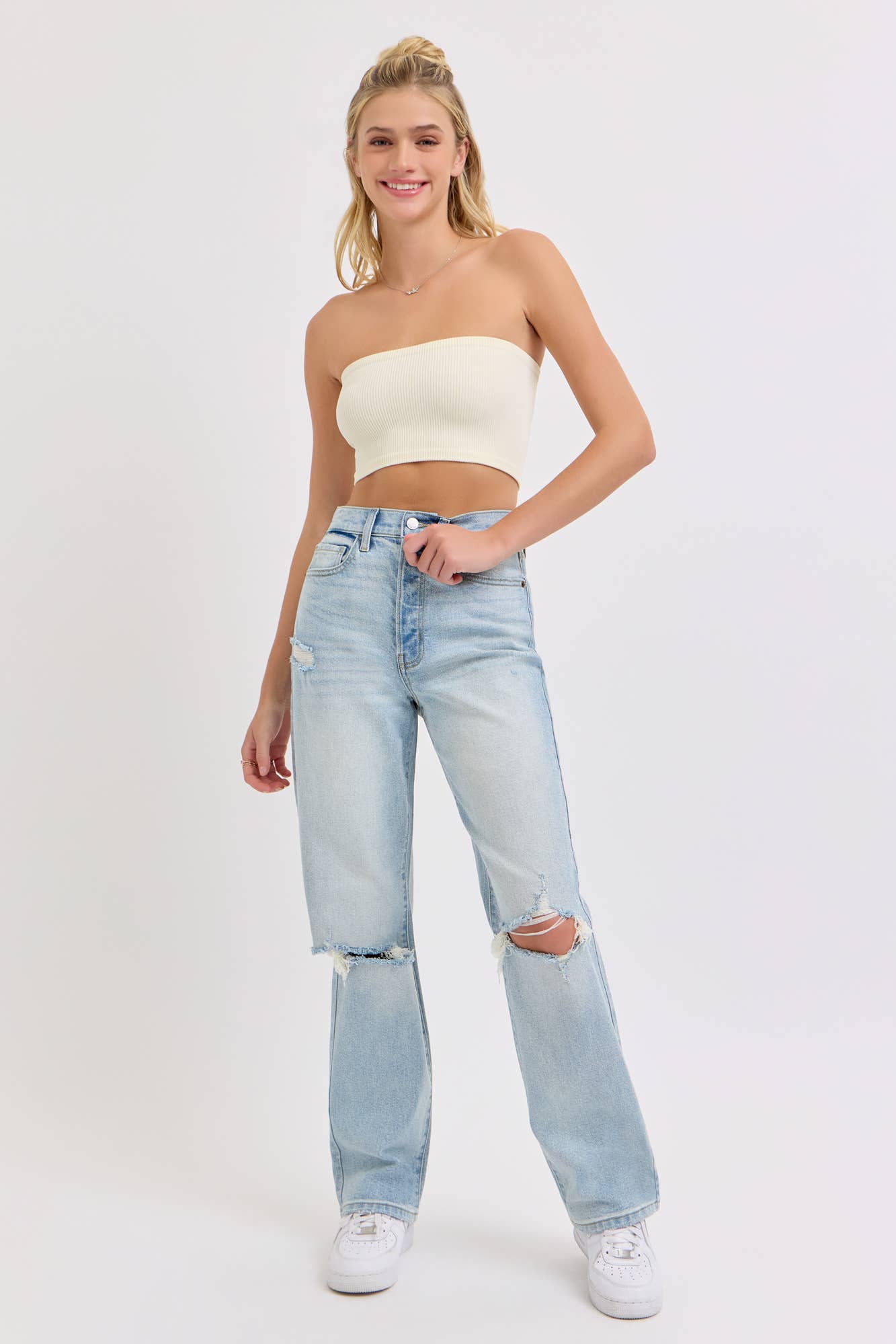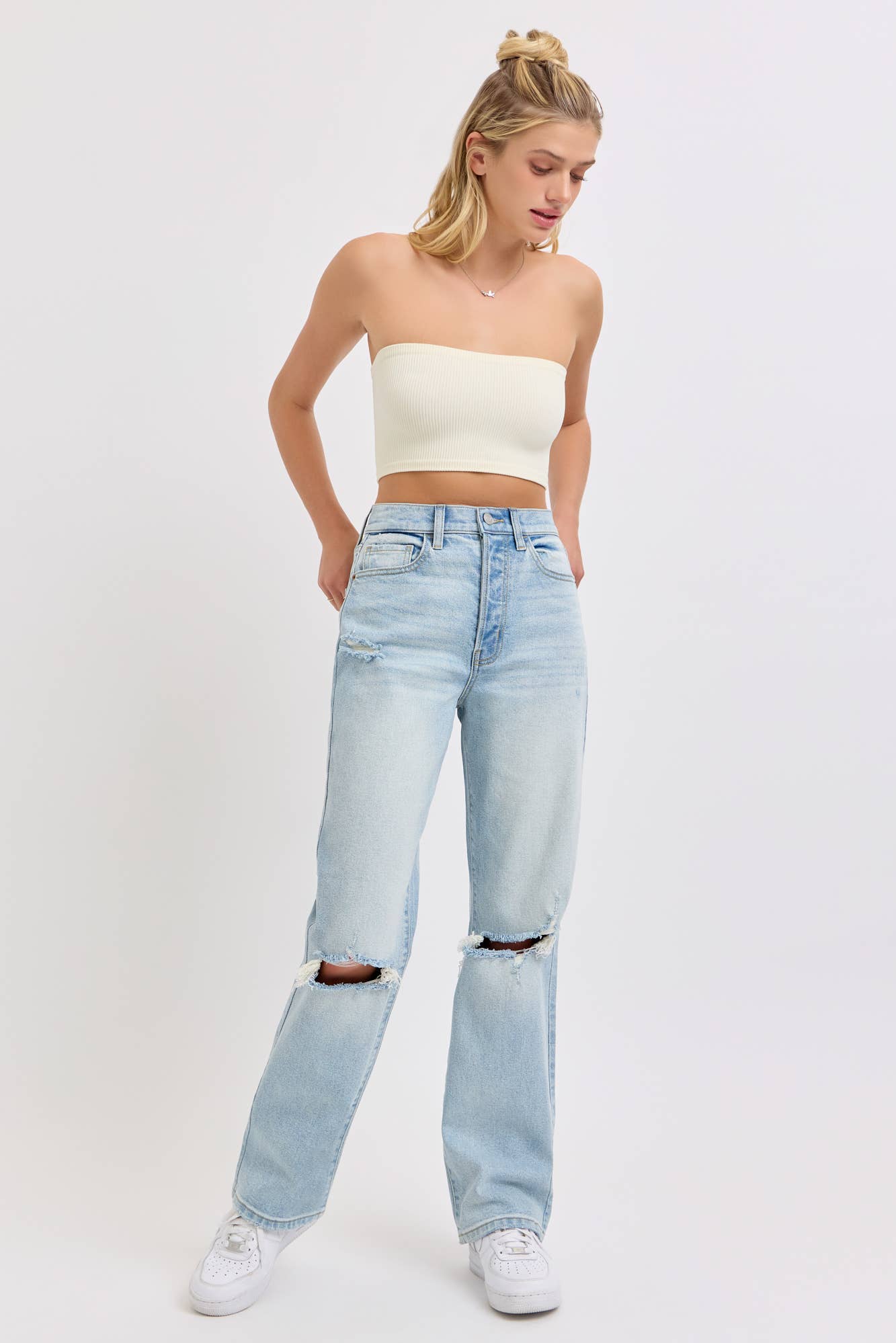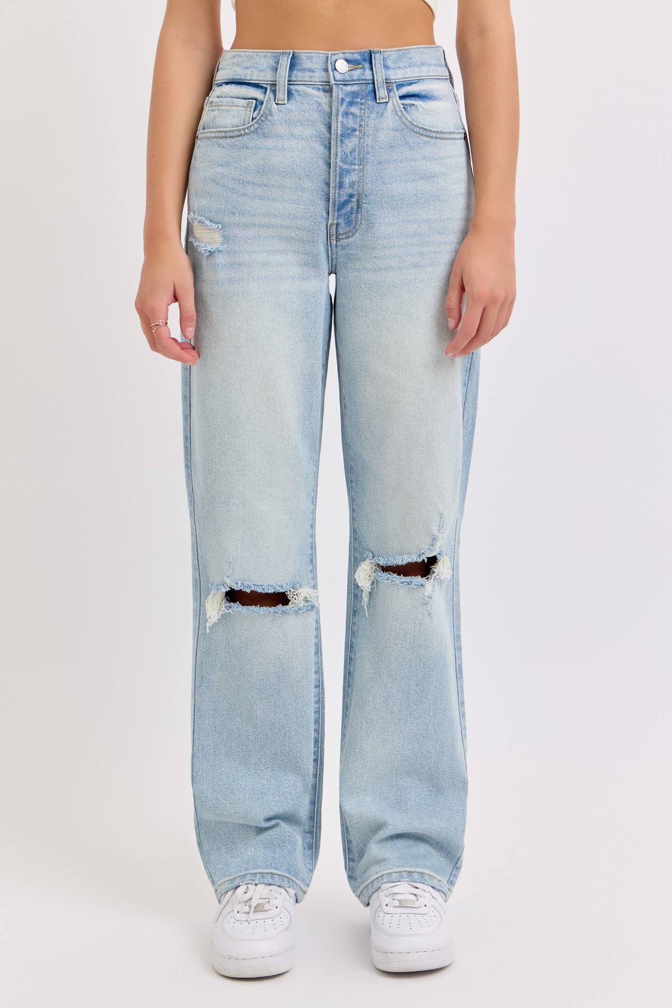 Super High Rise Destroy Dad Jean Light Denim Import Front Rise 12" , Inseam 31" Fabric Content: 99% Cotton, 1% Spandex